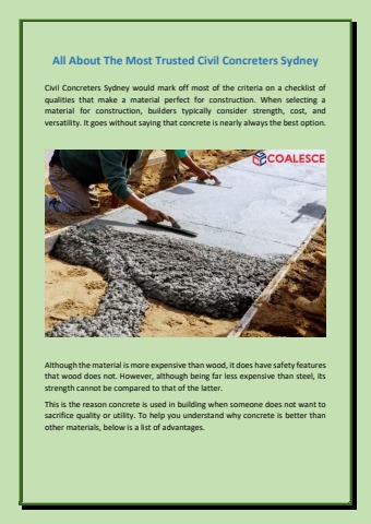 Civil Concreters Sydney would mark off most of the criteria on a checklist of qualities that make a material perfect for construction. When selecting a material for construction, builders typically consider strength, cost, and versatility. It goes without saying that concrete is nearly always the best option.