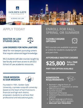Golden Gate University’s Master of Law Studies (MLS) is designed to provide graduates with a deep understanding of essential topics, major concepts, and core theories of law and legal studies to prepare them for legal-adjacent careers or a transition to law school. An MLS degree is ideal for non-lawyers pursuing careers that require advanced legal knowledge.