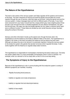 Injury to the Hypothalamus The Nature of the Hypothalamus The brain is the center of the nervous system and helps regulate all the systems and functions
