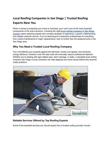 When it comes to protecting your home or business, your roof is one of the most important components of the entire structure. Choosing the right local roofing company San Diego County means selecting experts who combine decades of experience, superior craftsmanship, and reliable customer service. If you’re searching for trustworthy professionals for everything from routine maintenance to major replacements, look no further than the seasoned pros in the San Diego area.