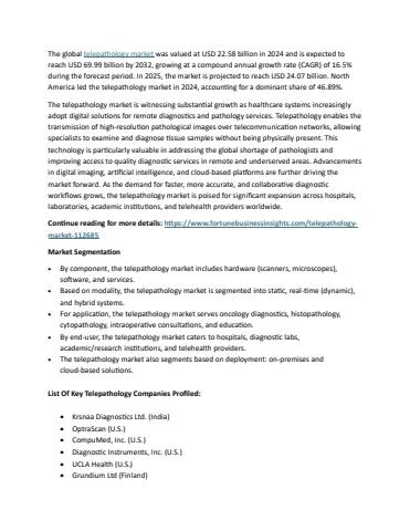 The global telepathology market was valued at USD 22.58 billion in 2024 and is expected to reach USD 69.99 billion by 2032, growing at a compound annual growth rate (CAGR) of 16.5% during the forecast period. In 2025, the market is projected to reach USD 24.07 billion. North America led the telepathology market in 2024, accounting for a dominant share of 46.89%.