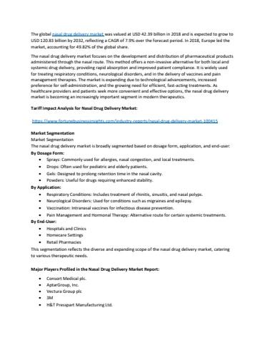 The global nasal drug delivery market was valued at USD 42.39 billion in 2018 and is expected to grow to USD 120.83 billion by 2032, reflecting a CAGR of 7.9% over the forecast period. In 2018, Europe led the market, accounting for 49.82% of the global share.
