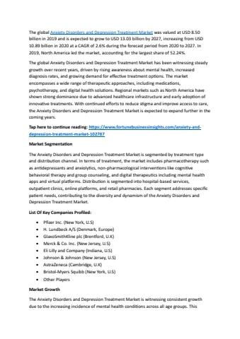 The global Anxiety Disorders and Depression Treatment Market was valued at USD 8.50 billion in 2019 and is expected to grow to USD 13.03 billion by 2027, increasing from USD 10.89 billion in 2020 at a CAGR of 2.6% during the forecast period from 2020 to 2027. In 2019, North America led the market, accounting for the largest share of 52.24%.