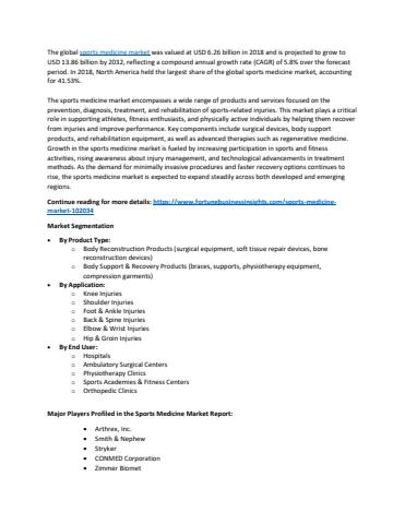 The global sports medicine market was valued at USD 6.26 billion in 2018 and is projected to grow to USD 13.86 billion by 2032, reflecting a compound annual growth rate (CAGR) of 5.8% over the forecast period. In 2018, North America held the largest share of the global sports medicine market, accounting for 41.53%.