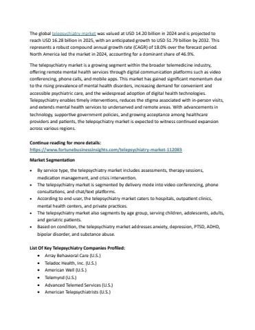 The global telepsychiatry market was valued at USD 14.20 billion in 2024 and is projected to reach USD 16.28 billion in 2025, with an anticipated growth to USD 51.79 billion by 2032. This represents a robust compound annual growth rate (CAGR) of 18.0% over the forecast period. North America led the market in 2024, accounting for a dominant share of 46.9%.