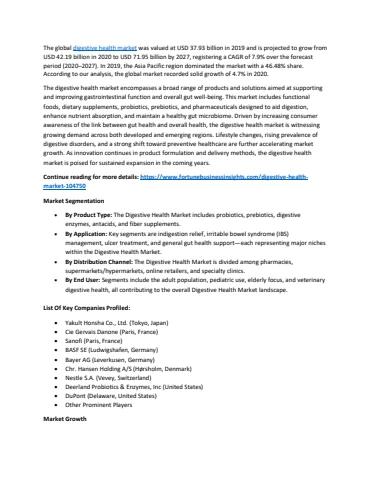 The global digestive health market was valued at USD 37.93 billion in 2019 and is projected to grow from USD 42.19 billion in 2020 to USD 71.95 billion by 2027, registering a CAGR of 7.9% over the forecast period (2020–2027). In 2019, the Asia Pacific region dominated the market with a 46.48% share. According to our analysis, the global market recorded solid growth of 4.7% in 2020.