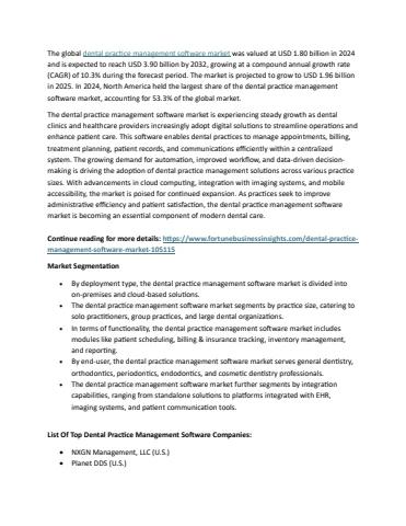 The global dental practice management software market was valued at USD 1.80 billion in 2024 and is expected to reach USD 3.90 billion by 2032, growing at a compound annual growth rate (CAGR) of 10.3% during the forecast period. The market is projected to grow to USD 1.96 billion in 2025. In 2024, North America held the largest share of the dental practice management software market, accounting for 53.3% of the global market.