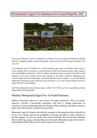 A monument sign for business is a free-standing sign, that is typically made from a stone, marble, brick, concrete, or metal structure with your business name, logo, tagline, and wayfinding information. These modern monument signs are placed mostly at the entrance or at some distance from your facility to provide a cohesive appearance to visitors right from the beginning. At Grand Rapids Custom Signs, we provide highly impactful monument signs that have the potential to set your Grand Rapids business apart from the surroundings.
