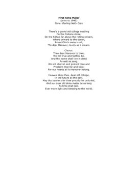 First Alma Mater (prior to 1940) Tune: Darling Nelly Gray . There's a grand old college nestling . On the Indiana shore, On the hilltop far above the rolling stream,