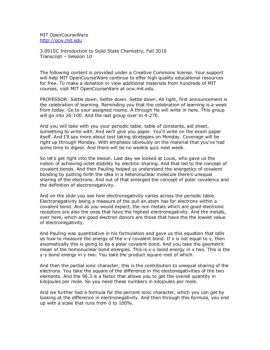 MIT OpenCourseWare . http://ocw.mit.edu . 3.091SC Introduction to Solid State Chemistry, Fall 2010 . Transcript – Session 10 . The following content is provided ...
