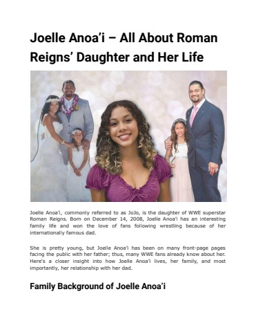 Joelle Anoa’i, the eldest daughter of WWE superstar Roman Reigns and Galina Becker, is growing up in the spotlight. Born in 2008, Joelle, affectionately called “JoJo,” shares a close bond with her father, often appearing in WWE promotions. She balances a normal childhood with glimpses into her father’s fame, excelling in school and extracurricular activities. Roman Reigns often emphasizes the importance of family, making Joelle a cherished part of his inspiring journey.