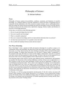 PST 3115 FALL 2008 Philosophy of Science Dr. Michael Hoffmann Focus Philosophy of Science explores the possibilities, conditions, constraints, and limitations of ...