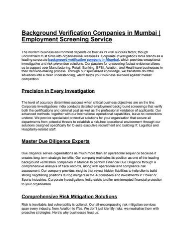 Corporate Investigations India stands as a leading corporate background verification company in Mumbai, which provides exceptional investigative and risk prevention solutions. Our passion for uncovering factual evidence allows us to support over Manufacturing, Retail, Banking, BFSI, Aviation, and Healthcare businesses in their decision-making process. Through our specialised knowledge, we transform doubtful situations into a clear understanding, which helps your business succeed against market competition.