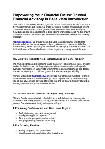 At Efficient Capital, we proudly serve the Bella Vista community with tailored financial solutions that address your unique goals and circumstances. Whether you're building wealth, planning for retirement, or managing business finances, our dedicated team of financial advisors is here to guide you every step of the way.