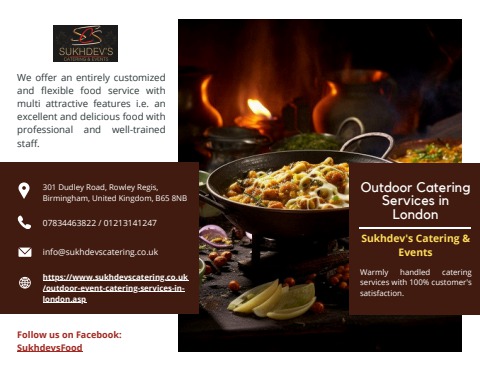 Get an exquisite outdoor catering services in London. Elevate your wedding with exceptional culinary expertise of Sukhdev's Catering. From intimate gatherings to lavish affairs, Sukhdev specialize in crafting unforgettable dining experiences tailored to your preferences. Trust Sukhdev's Catering for seamless execution, unparalleled taste, and unparalleled service. Click to learn more at https://www.sukhdevscatering.co.uk/outdoor-event-catering-services-in-london.asp