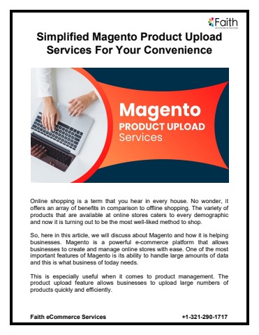 Magento product upload and Product Data Entry both are powerful features that allow businesses to upload numerous products quickly and professionally. This feature is especially useful for businesses with large inventories of products. By using this feature businesses can save time and popularize their product management process. Read more: https://www.articlefloor.com/simplified-magento-product-upload-services-for-your-convenience/