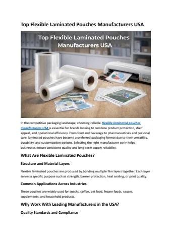 In the competitive packaging landscape, choosing reliable Flexible laminated pouches manufacturers USA is essential for brands looking to combine product protection, shelf appeal, and operational efficiency. From food and beverage to pharmaceuticals and personal care, laminated pouches have become a preferred packaging format due to their versatility, durability, and customization options. Selecting the right manufacturer early helps businesses ensure consistent quality and long-term supply reliability.