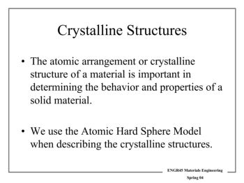 ENGR45 Materials Engineering Spring 04 Crystalline Structures • The atomic arrangement or crystalline structure of a material is important in determining the ...