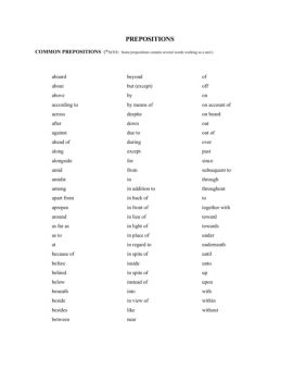 PREPOSITIONS COMMON PREPOSITIONS (*NOTE: Some prepositions contain several words working as a unit.) aboard about above according to across