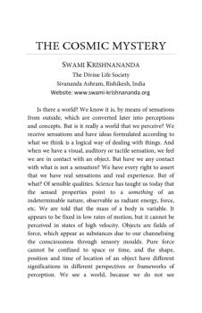 THE COSMIC MYSTERY. S. WAMI . K. RISHNANANDA. The Divine Life Society . Sivananda Ashram, Rishikesh, India . Website: www.swami-krishnananda.org. Is there a world?
