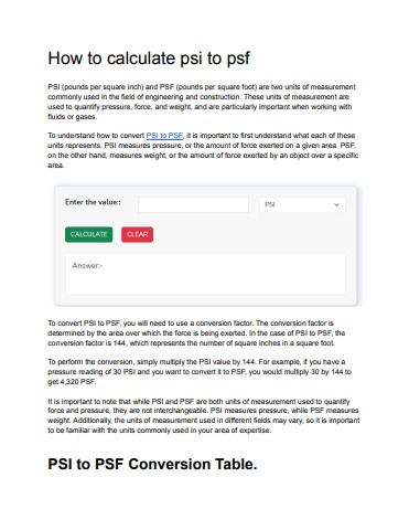PSI (pounds per square inch) and PSF (pounds per square foot) are two units of measurement commonly used in the field of engineering and construction. These units of measurement are used to quantify pressure, force, and weight, and are particularly important when working with fluids or gases.