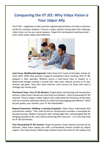 Vidya Vision stands out as the premier choice for IIT JEE coaching in Jaipur. Renowned for its expert faculty and personalized attention, Vidya Vision offers comprehensive preparation tailored to individual needs. With a track record of success, it's the trusted destination for aspiring engineers seeking top-notch guidance and academic excellence.