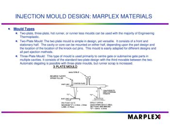 INJECTION MOULD DESIGN: MARPLEX MATERIALS Mould Types Two-plate, three-plate, hot runner, or runner less moulds can be used with the majority of Engineering