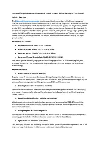 The global DNA modifying enzymes market size was valued at USD 1.19 billion in 2024. The market is projected to grow from USD 1.28 billion in 2025 to USD 2.32 billion by 2032, exhibiting a CAGR of 8.9% during the forecast period. North America dominated the DNA modifying enzymes market with a market share of 49.57% in 2024.