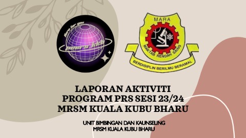 Laporan ini dihasilkan atas kerjasama Ahli PRS Tingkatan 2 & 3 sesi 23/24 MRSM KKB diketuai oleh Alma Arissa dan Sharifah Nur Hadirah serta dibantu dan disokong oleh Guru Kaunselor MRSM KKB, iaitu Pn. Nor Sarmila bt Ishak.
