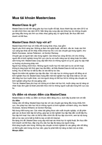 MasterClass là gì? MasterClass là một nền tảng giáo dục trực tuyến nổi bật, được thành lập vào năm 2012 và ra mắt chính thức vào năm 2015. Nền tảng này cung cấp các khóa học do những chuyên gia hàng đầu trong các lĩnh vực khác nhau giảng dạy, từ nghệ thuật, ẩm thực đến kinh doanh và thể thao. MasterClass thích hợp với ai? MasterClass thích hợp với nhiều đối tượng khác nhau, bao gồm: Người yêu thích sáng tạo: Những ai đam mê nghệ thuật, viết lách, nấu ăn, hoặc các lĩnh vực sáng tạo khác sẽ tìm thấy nhiều khóa học thú vị từ các chuyên gia trong ngành, như Martin Scorsese, James Patterson, và Gordon Ramsay. Chuyên gia và người làm việc trong ngành: Các khóa học cũng rất hữu ích cho những người đã có kinh nghiệm trong lĩnh vực của họ và muốn nâng cao kỹ năng hoặc tìm kiếm cảm hứng mới. MasterClass cung cấp kiến thức từ những người có uy tín, giúp họ cập nhật xu hướng và phương pháp mới. Người học không chính thức: Những người muốn học hỏi một cách tự do và linh hoạt, không bị ràng buộc bởi thời gian hay địa điểm, sẽ thấy MasterClass là một lựa chọn lý tưởng. Họ có thể học từ bất kỳ đâu và vào bất kỳ lúc nào. Người tìm kiếm trải nghiệm học tập độc đáo: Với việc học từ những người nổi tiếng và có kinh nghiệm thực tế, MasterClass mang đến một trải nghiệm học tập khác biệt so với các nền tảng học trực tuyến khác, nơi mà người dùng có thể học hỏi từ những câu chuyện và kinh nghiệm sống thực tế của giảng viên. Tóm lại, MasterClass phù hợp với những ai có đam mê học hỏi, muốn nâng cao kỹ năng cá nhân hoặc đơn giản là khám phá kiến thức mới từ những người xuất sắc trong lĩnh vực của họ. Ưu điểm và nhược điểm của MasterClass MasterClass có nhiều ưu điểm và nhược điểm đáng chú ý, dưới đây là phân tích chi tiết: Ưu điểm Giảng viên nổi tiếng: MasterClass hợp tác với các chuyên gia hàng đầu trong nhiều lĩnh vực, cho phép học viên học hỏi từ những người có kinh nghiệm và thành công, như Martin Scorsese, Serena Williams và Gordon Ramsay. Nội dung chất lượng cao: Các video bài giảng được sản xuất chuyên nghiệp, có độ phân giải cao và được biên tập kỹ lưỡng, giúp tạo ra trải nghiệm học tập hấp dẫn và dễ tiếp thu. Học tập linh hoạt: Học viên có thể tự điều chỉnh tốc độ học tập của mình, xem lại nội dung bất cứ lúc nào và từ bất kỳ thiết bị nào có kết nối Internet. Đa dạng chủ đề: MasterClass cung cấp một loạt các khóa học từ nghệ thuật, ẩm thực đến kinh doanh và thể thao, đáp ứng nhu cầu học tập đa dạng của người dùng. Khả năng truyền cảm hứng: Những câu chuyện và kinh nghiệm từ các giảng viên nổi tiếng có thể truyền cảm hứng cho học viên, giúp họ phát triển kỹ năng và đam mê cá nhân. Nhược điểm Chi phí cao: Mặc dù chất lượng nội dung tốt, nhưng mức phí đăng ký của MasterClass có thể cao hơn so với một số nền tảng khác như Udemy hay Skillshare, điều này có thể là rào cản cho một số người học. Thiếu tính thực hành: Một số học viên có thể cảm thấy rằng các khóa học không cung cấp đủ hướng dẫn cụ thể hoặc thực hành, mà chủ yếu tập trung vào lý thuyết và cảm hứng. Nội dung có thể dễ dàng tìm thấy: Một số người dùng cho rằng nhiều thông tin trong các khóa học có thể đã có sẵn miễn phí trên các nền tảng khác như YouTube, dẫn đến sự hoài nghi về giá trị của việc trả tiền cho khóa học. Không phù hợp cho người học thích môi trường truyền thống: MasterClass có thể không lý tưởng cho những ai thích học trong môi trường tương tác trực tiếp hoặc cần sự hướng dẫn cụ thể hơn từ giảng viên. Tóm lại, MasterClass mang lại nhiều lợi ích cho người học, đặc biệt là những ai đam mê sáng tạo và muốn học hỏi từ các chuyên gia. Tuy nhiên, chi phí và cách thức giảng dạy có thể không phù hợp với mọi người. Nguồn: https://eliskey.com/mua-tai-khoan-masterclass/
