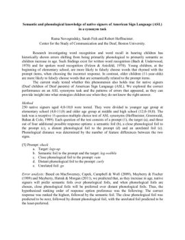 Semantic and phonological knowledge of native signers of American Sign Language (ASL) in a synonym task Rama Novogrodsky, Sarah Fish and Robert Hoffmeister.