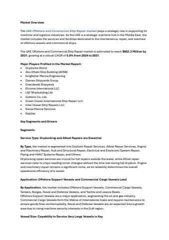 The Offshore and Commercial Ship Repair market in the UAE plays a strategic role in supporting its maritime and logistics industries.