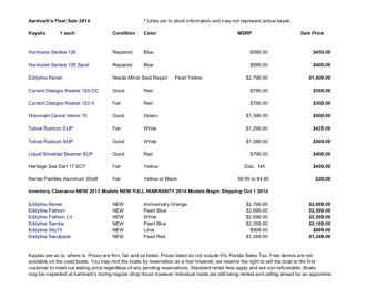 Aardvark's Fleet Sale 2014 Kayaks 1 each Condition Color MSRP Sale Price Repaired Blue $999.00 $450.00 Repaired Blue $999.00 $400.00 Needs Minor Seat Repair Pearl ...