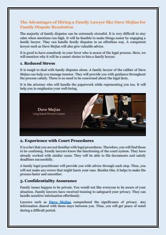 The majority of family disputes can be extremely stressful. It is very difficult to stay calm when emotions run high. It will be feasible to make things easier by engaging a family lawyer. They can handle family disputes in an effortless way. A competent lawyer such as Dave Mejias will also give valuable advice. https://www.mylongislandlawyers.com/