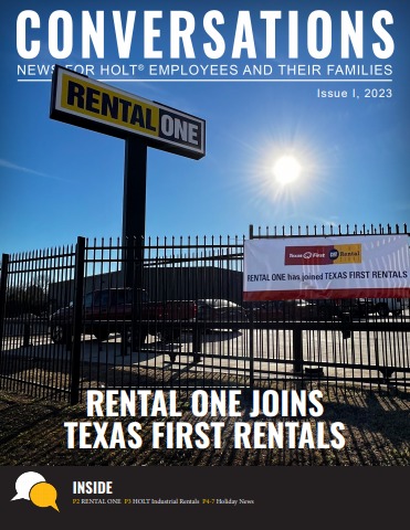 2 CONVERSATIONS Issue I COVER STORY HOLT INDUSTRIAL RENTALS In mid-December, Texas First Rentals expanded with the acquisition of Rental One. Rental One, founded in 2004 in Colleyville, Texas, has equipment rental roots going back to the 1950s when it was established as a family-owned, full-service equipment and storage container rental company offering a full line of well-maintained, quality construction equipment, and concrete, safety, erosion control and construction supplies in 15 locations throughout Dallas-Fort Worth and Central Texas. Like Texas First Rentals and HOLT, Rental One has built a family legacy of serving customers with excellence and a reputation for passionately serving the communities where they live and work. Don Myrick, Sr. Vice President and General Manager - Texas First Rentals, noted, “We recognize the value of bringing Rental One and its employees to our organization and I’m confident that the Rental One team will align well with our uniquely Texas culture and core values. “I am excited about the opportunity to expand the Texas First Rentals footprint to 40 locations and solidify our position as the leading construction equipment rental provider in Texas. We look forward to learning from the team at Rental One and leveraging the best practices from both organizations to provide our customers with legendary service,” said Don. Rental One and Texas First Rentals joining forces will create a stronger rental company to serve the needs of customers throughout our territory. Rental One’s corporate values and mission of serving others with excellence aligns well with Texas First Rentals’ core values. “Our team has worked to build a successful business with meaningful relationships that span three generations,” said Rental One President Mike O’Neal. “Our customers will benefit from a broader range of products and combined expertise as we join the Texas First Rentals team. We continue to be committed to providing customers with the best equipment and reliable service they have grown to know.” “I’m confident joining a values-based organization is a positive move for us all,” said O’Neal, “and we look forward to collaborating with the Texas First Rentals team to build upon our mutual success.” This acquisition will allow Texas First Rentals to expand its presence to a total of 40 locations in highly-attractive regions poised for future growth. Rental One Joins Texas First Rentals On the cover: RentalOne in Van Alstyne, north of Dallas, is one of the new Texas First Rentals locations.