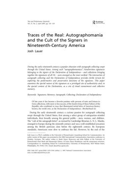 Downloaded By: [University of Pennsylvania] At: 01:16 28 March 2007 Traces of the Real: Autographomania and the Cult of the Signers in Nineteenth-Century America