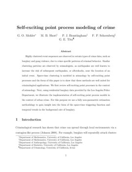 Self-exciting point process modeling of crime G. O. Mohler M. B. Shorty P. J. Brantinghamz F. P. Schoenbergx G. E. Tita{Abstract Highly clustered event sequences are ...