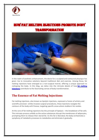 This PDF explains how fat melting injections can help you achieve the body transformation you've been striving for. Learn how these injections work to melt away stubborn fat from areas like the abdomen, thighs, and hips. Discover the benefits of fat melting injections over other fat reduction procedures. Read patient testimonials and see before and after photos of their remarkable transformations. Contact Rejuven Med Spa to find out if our Fat Melting Injections are the solution to help you slim down and sculpt your body. Visit: https://www.rejuvenmedspa.com/injectables/#fat-loss