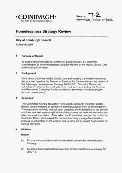 THE CITY OF EDINBURGH COUNCIL Homelessness Strategy Review City of Edinburgh Council 12 March 2009 I Purpose of Report To submit recommendations, in terms of Standing ...