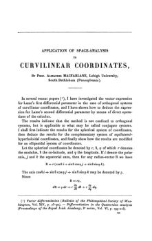 APPLICATION OF SPACE-ANALYSIS TO CURVILINEAR COORDINATES, BY PROF. ALEXANDER MACFARLANE, Lehigh University, South Bethlehem (Pennsylvania). In several recent papers ...