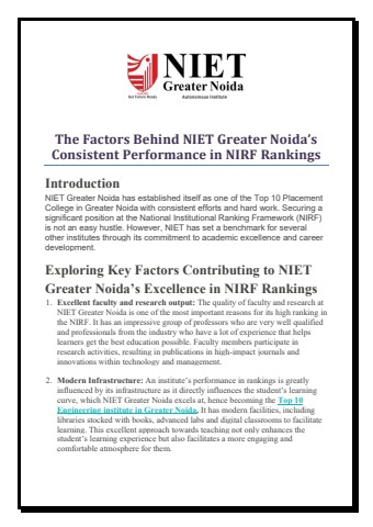 NIET Greater Noida has emerged as a Top 10 Placement College in Greater Noida due to its exceptional faculty, cutting-edge infrastructure, and robust placement record. The institute’s focus on research, inclusive learning, and strong industry ties has secured its position in the prestigious NIRF rankings, setting a benchmark for academic excellence.
