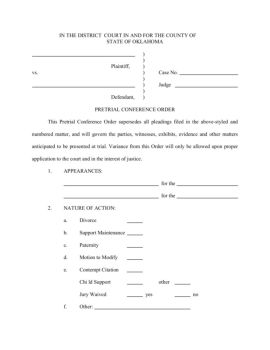 IN THE DISTRICT COURT IN AND FOR THE COUNTY OF STATE OF OKLAHOMA)) Plaintiff, ) vs. ) Case No. )) Judge ) Defendant, ) PRETRIAL CONFERENCE ORDER
