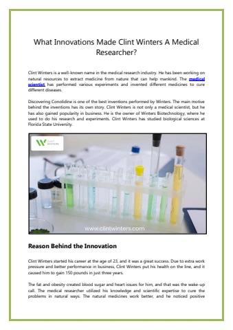 Clint Winters, the medical researcher, presents a valuable example of a business entrepreneur applying their scientific training practically. He has established a business using his experience and research to discover things that help people. Visit: https://clintwinters.com/