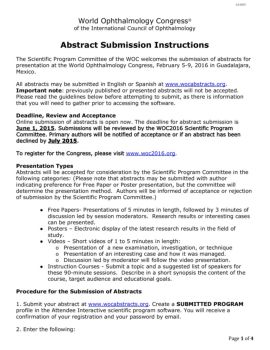 6.3.2015 World Ophthalmology Congress ® of the International Council of Ophthalmology Abstract Submission Instructions The Scientific Program Committee of the WOC ...