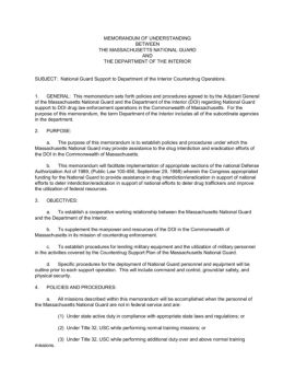 MEMORANDUM OF UNDERSTANDING BETWEEN THE MASSACHUSETTS NATIONAL GUARD AND THE DEPARTMENT OF THE INTERIOR SUBJECT: National Guard Support to Department of the Interior ...