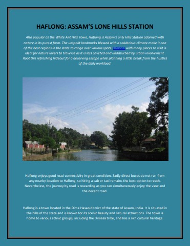 Haflong is a town in the Dima Hasao district of Assam, India. It is the district headquarters and the only hill station in Assam. Haflong is located at an altitude of 680 meters above sea level and is surrounded by hills and mountains. It is known for its scenic beauty, cool weather, and vibrant culture.