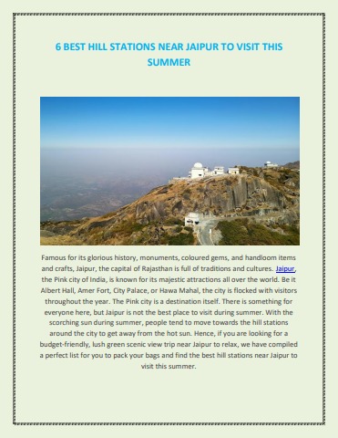 Jaipur, the Pink City of India, is surrounded by a beautiful landscape of hills and forests. There are several hill stations near Jaipur that offer a cool respite from the scorching heat of the city. Here are some of the popular hill stations near Jaipur: