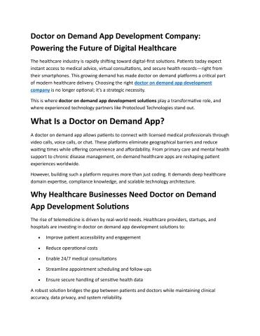 Doctor on demand app development solutions by Protocloud Technologies to build secure, scalable telemedicine apps for modern healthcare businesses.