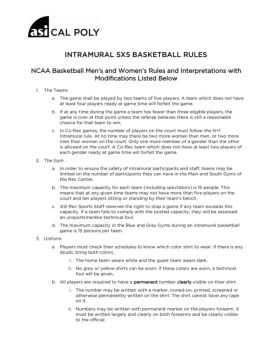 INTRAMURAL 5X5 BASKETBALL RULES NCAA Basketball Men’s and Women’s Rules and Interpretations with Modifications Listed Below 1. The Teams a.