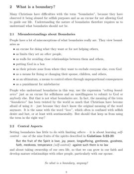 2 What is a boundary? Many Christians have difficulties with the term “boundaries”, because they have observed it being abused for selfish purposes and as an ...